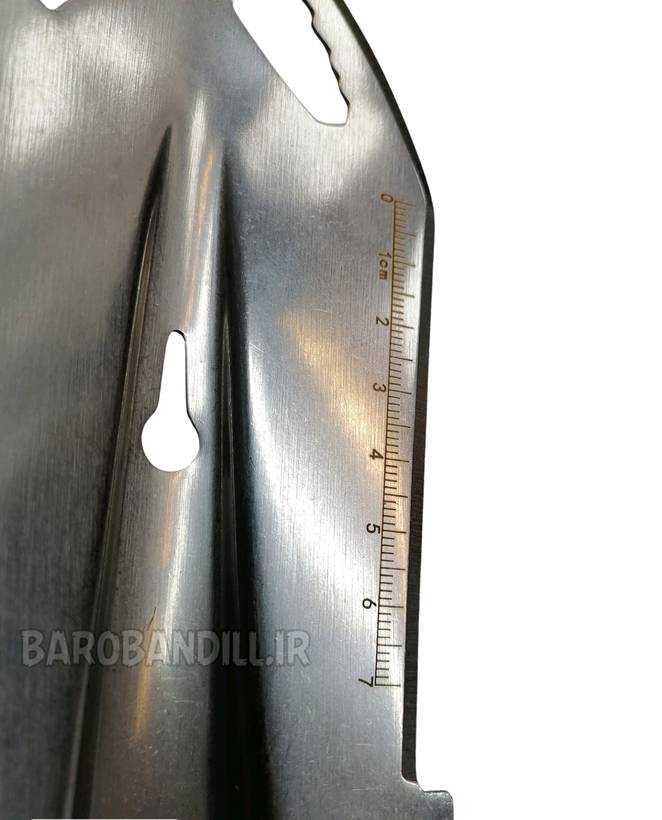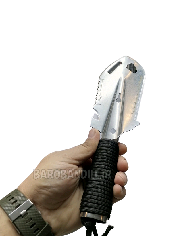 دارای لبه اره ای ، لبه خط کش دار،آچار بر روی بیلچه
